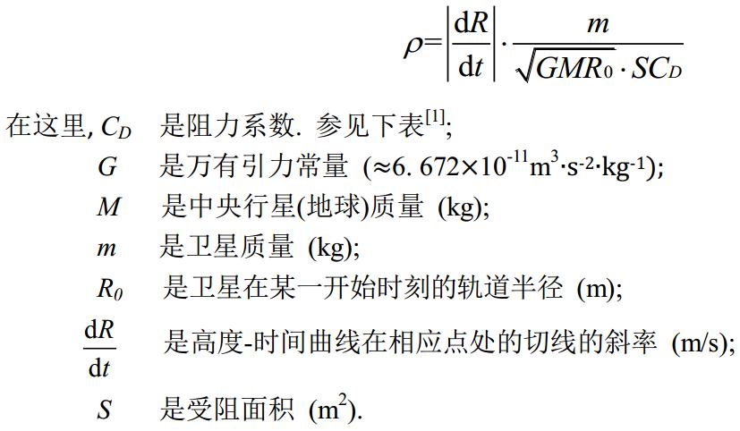 這種模式是否具有實(shí)用意義主要取決于離子在工作環(huán)境中是否充足, 即是說(shuō), 我們首先必須先測(cè)出高層大氣的近似的密度. 又因?yàn)樗? 無(wú)法直接測(cè)量, 我就想出一種間接的方法: 通過(guò)測(cè)量不受控制的近地軌道衛(wèi)星的軌道高度的自然衰減. 由于密度可由作用于衛(wèi)星上的大氣阻力大小求出, 這個(gè)阻力間接地體現(xiàn)在衛(wèi)星高度衰減上, 因此通過(guò)計(jì)算我們得出密度ρ (kg/m3 ):