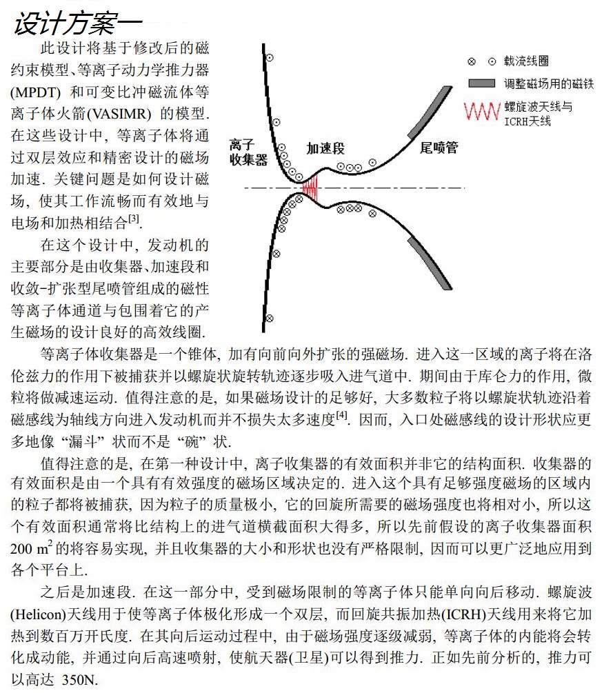 這一事實(shí)讓我想起了使用的離子推進(jìn)器的衛(wèi)星, 如SMART和DAWN衛(wèi)星等. 離子推進(jìn)器的廣泛應(yīng)用說(shuō)明了人類在短距離小空間內(nèi)加速離子的技術(shù)日臻成熟. 這也同時(shí)讓我考慮到一個(gè)新的模型——融合傳統(tǒng)離子推進(jìn)器和沖壓發(fā)動(dòng)機(jī)的設(shè)計(jì), 讓等離子體代替空氣進(jìn)入進(jìn)氣道, 然后使用電場(chǎng)和磁場(chǎng)來(lái)加速, 以取代化學(xué)燃料的燃燒. 這就是我的想法的概述.