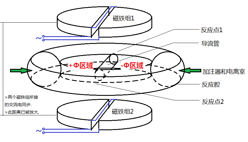 如圖, 兩組電磁鐵平行放置, 反應(yīng)腔夾于磁鐵之間. 每個(gè)電磁鐵組水平均分為兩半, 中間以狹縫隔開. 其線圈繞組使得在通交流電時(shí)兩半的磁場(chǎng)方向相反, 大小相同. 兩組電磁鐵通以同步高頻交流電, 于是就可以使兩組電磁鐵之間的半邊磁通量變化, 從而在反應(yīng)腔所在的位置產(chǎn)生渦旋電場(chǎng). 兩邊的渦旋電場(chǎng)在反應(yīng)腔中部橫穿的導(dǎo)流管處疊加. 導(dǎo)流管兩端自然產(chǎn)生主、副對(duì)撞點(diǎn), 即反應(yīng)點(diǎn)1和2. 反應(yīng)腔內(nèi)同時(shí)還存在水平方向同軸的環(huán)形磁場(chǎng)(此點(diǎn)與托卡馬克相同), 用于約束粒子沿環(huán)形軌跡運(yùn)動(dòng), 并在反應(yīng)點(diǎn)處收緊以壓縮等離子體.