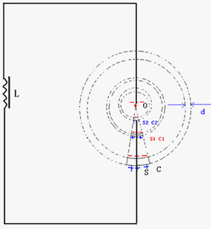 如圖3,在一個由“點電極”O(jiān)與“球冠電極”S組成的“球錐空間”中,如果O與S之間產(chǎn)生了足夠的“特高電壓”,那么這個“球錐空間”就可以被“雙向激擊”,依次連續(xù)發(fā)生“球冠振蕩”……、S2、……、S1、……、S,產(chǎn)生不同頻率的“電磁波”,并且呈“嵌套球狀”分布,由外到里即由球冠S到點O,產(chǎn)生的“電磁波”的頻率越來越大。由外向里,由球面向球心,產(chǎn)生的電磁波的頻率可以從“可見波”頻率,逐漸增大,有的可以達到紫外線頻率、X射線頻率,甚至出現(xiàn)伽馬射線頻率。[3][4]
