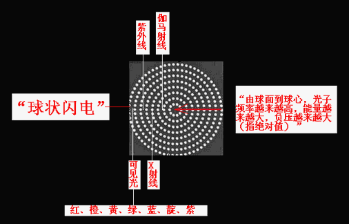 “棒電極”在球心對“球冠電極”“超短時間內的高能”充電、放電,可以產(chǎn)生“球狀閃電”,其機理為:“雙向激擊”、“球冠振蕩”。因為“球冠振蕩”的頻率的不同,“球狀閃電”內部呈現(xiàn)“嵌套球狀”,由外向里頻率由小到大,在可見光波段由外向里顯現(xiàn)為紅、橙、黃、綠、藍、靛、紫,而由外向里看,因疊加合成呈現(xiàn)白色,但是,當最外面的頻率較小時,也可能是黃色或綠色或藍色的;一個大“光球”,可以分離為兩個或幾個小“光球”,但其顏色將會“變深”。[3][4]
