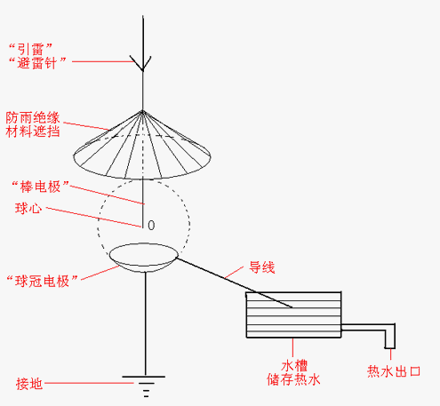 如圖7,可以在“雷擊村”,或其他發(fā)生“閃電”較多的區(qū)域,并且遠離居民區(qū)的地方,放置一些大大小小的“棒電極——球冠電極”?!鞍綦姌O”樹立于空中,用于招引閃電,類似于“避雷針”,但必須與其接地的支撐物絕緣,并且深入到“球冠電極”球心的頂端部位,越細越好——越細激發(fā)的“球狀閃電”的能量越大?!扒蚬陔姌O”的頂端接地,在其邊沿接一導線引入水槽,在閃電放電時,產(chǎn)生的“球狀閃電”可以沿導線進入水槽,“球狀閃電”所含的部分能量——熱能可以加熱水,這樣“閃電”的能量,就可以通過“接轉”為“球狀閃電”,再把可以“暫時儲存能量”的“球狀閃電”的部分能量——熱能傳給水,人們就可以利用熱水用于工業(yè)生產(chǎn)或日常生活了。